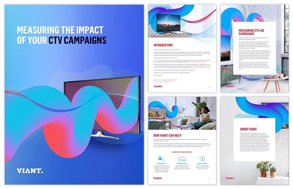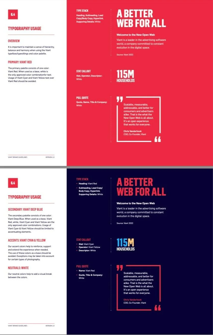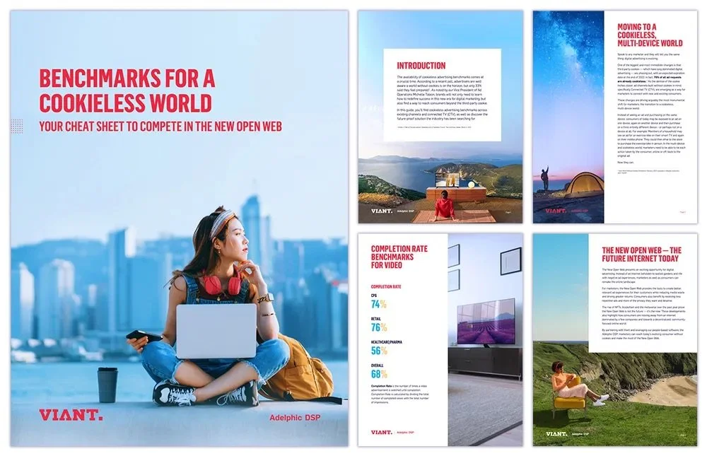 Months of competitive analysis and workshopping of colors, typesetting, design systems and photography culminated in the 2022 launch of Viant’s new brand identity across all client-facing materials.